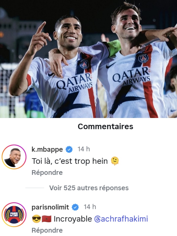 Kylian Mbappé, meilleur buteur de l’histoire du PSG et désormais au Real Madrid, n’a pas caché son admiration pour la performance de son ancien coéquipier Achraf Hakimi. Sur Instagram, après la rencontre, le latéral marocain a posté des photos de la victoire accompagnées de la mention « Soirée de Ligue des champions ». Mbappé a commenté :